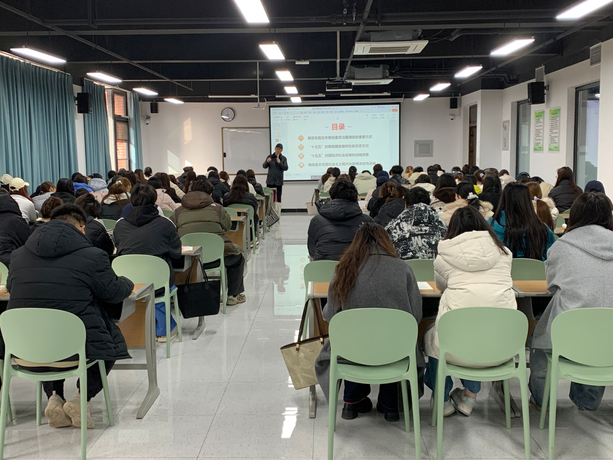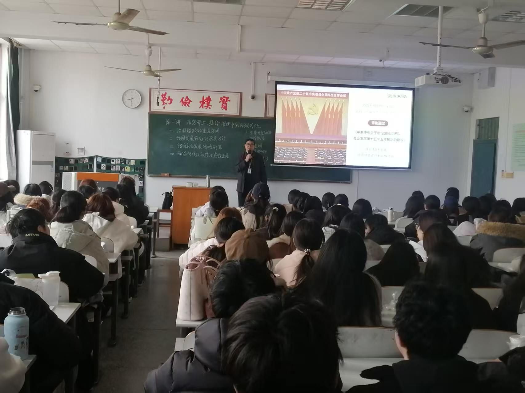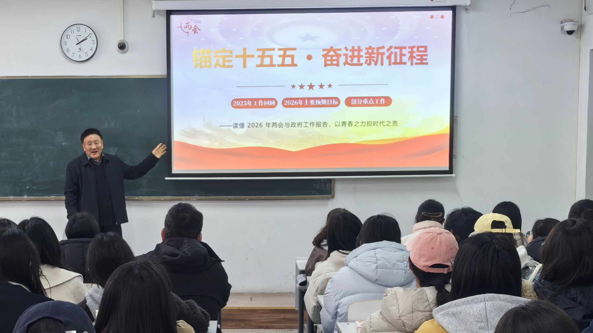 课堂上,老师们围绕“展望‘十五五’规划蓝图、明确2026年发展目标、勇担青年使命”三大核心内容,详细解读了“十五五”时期国家经济社会发展的总体布局与宏伟蓝图,阐释了新发展阶段、新质生产力、高质量发展等核心概念。通过聚焦科技创新、乡村振兴、绿色发展、民生保障等重点领域,生动展现了国家未来五年的发展愿景,帮助学生清晰把握前进方向,找准时代发展机遇。同时,老师们紧密结合当代大学生的身份定位,讲述新时代青年在各行各业奋勇争先的鲜活事例,引导学生们将个人理想追求融入国家和民族事业,把学业精进、本领提升与时代需求紧密结合,以过硬的专业素养和坚定的理想信念,担当起时代赋予的重任,在全面建设社会主义现代化国家新征程中贡献青春力量。