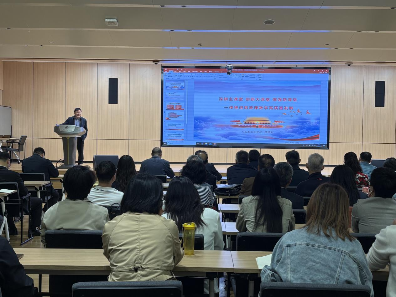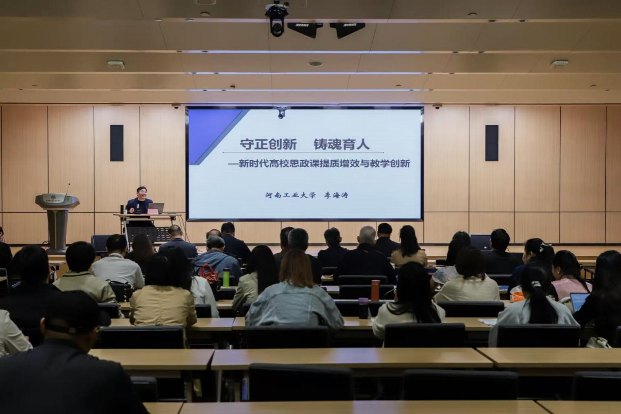 河南工业大学马克思主义学院院长李海涛以“守正创新 铸魂育人——新时代高校思政课提质增效与教学创新”为主题进行了专题辅导。他以“立德树人”为主线,系统梳理了习近平总书记关于思政课“讲道理”的本质要求、“六个要”的教师标准、“八个统一”的教学原则与“大思政课”理念。他认为,在教师队伍建设方面,要突出“三可三为”总体评价和“六个要”素质要求;在思政课教学理念方面,要遵循思想政治工作规律、教书育人规律和学生成长成才规律,增强教学的针对性、实效性和亲和力;在思政课改革创新方面,要善用社会大课堂,推进大中小学思政教育一体化,构建纵向层层递进、横向密切配合的课程体系,运用新媒体新技术推动传统优势与信息技术高度融合,让思政课真正“活起来”。同时,他结合教学内容、教学设计、课件制作等方面分享了思政课教学技能竞赛的实践经验,并勉励青年教师增强积极性、主动性与创造性,持续加强自身修养与知识积累。